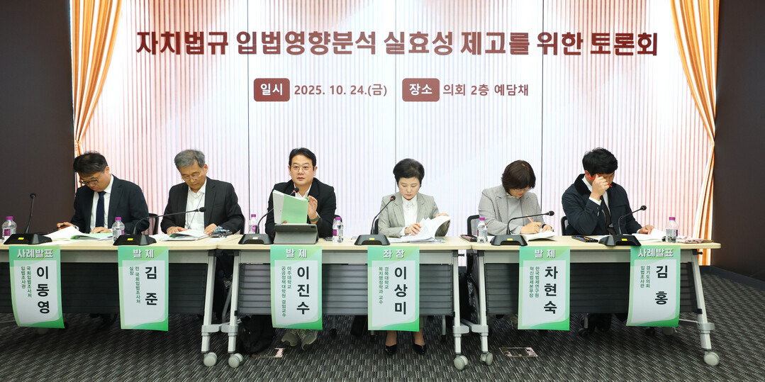 사례발표에서는 경기도의회 김홍 입법조사관이 도의회의 사후입법영향평가 현황과 과제를, 국회입법조사처 이동영 입법조사관이 국회의 입법영향분석 사례를 각각 소개했다. 이어 경복대학교 복지행정학과 이상미 교수를 좌장으로 한 종합토론이 진행되며, 자치법규 입법영향분석 제도의 실효성을 높이기 위한 다양한 의견이 제시됐다.