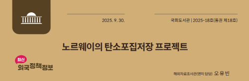 [입법정책뉴스] 국회도서관은 30일 '노르웨이의 탄소포집저장 프로젝트'를 다룬 '최신외국정책정보'(2025-18호, 통권 제18호)를 발간했다.