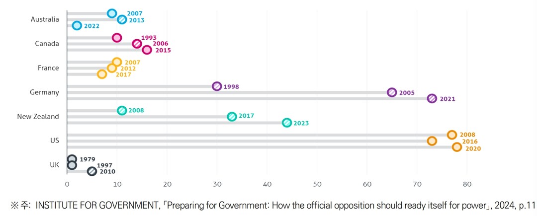 우리나라를 비롯하여 미국 등 대통령제 국가의 경우 대선이 끝나면 당선자는 취임 이전까지 60-70일 정도의 기간 동안 대통령직 인수위를 꾸려서 집권 준비를 하는 것이 일반적이다. 반면 총선 결과 의회의 다수당이 내각을 구성하는 의원내각제 국가의 경우 정권인수인계 기간을 별도로 정하고 있지 않다.