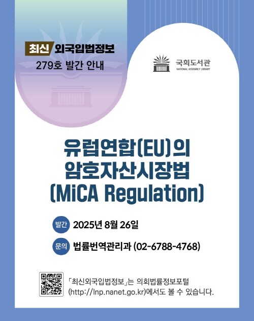 [입법정책뉴스] 국회도서관은 26일 유럽연합(EU)의 암호자산시장법, 일명 MiCA법을 주제로 한 '최신외국입법정보'(2025-16호, 통권 제279호)를 발간했다고 밝혔다.