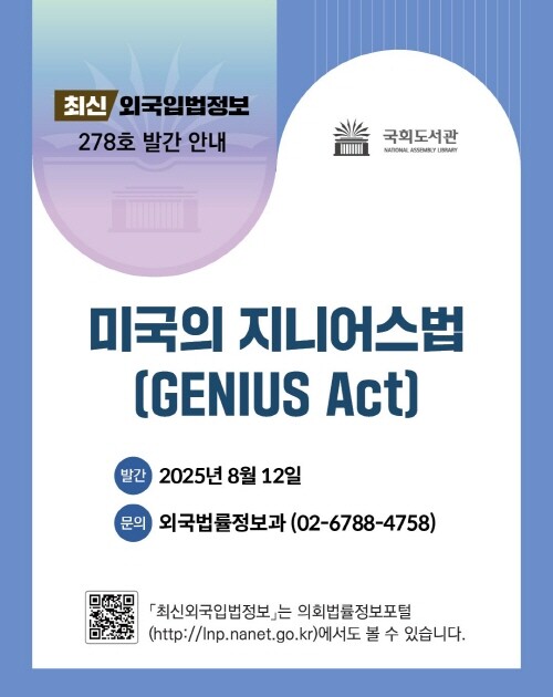 [입법정책뉴스] 국회도서관은 12일 미국의 스테이블코인 관련 법률인 '지니어스법(GENIUS Act)'을 주제로 한 '최신외국입법정보'(2025-15호, 통권 제278호)를 발간했다.